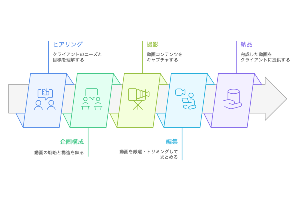 「ヒアリング → 企画構成 → 撮影 → 編集 → 納品」 の順で進みます。